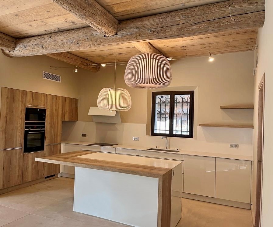 4 chambres, 3 salles de bains, 4 wc séparés, pièce à vivre de 70 m² incluant une cuisine équipée, un salon / salle à manger avec canapé, une cheminée en pierre.